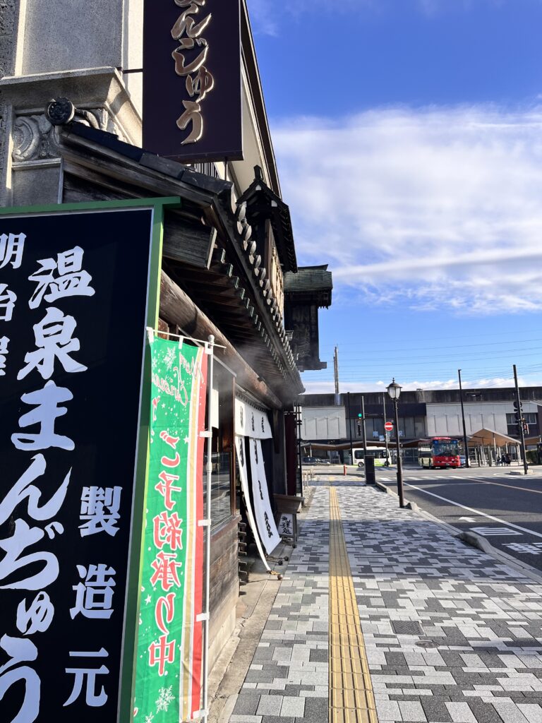 出来立てのほかほか温泉まんじゅうを食べる方でいっぱい