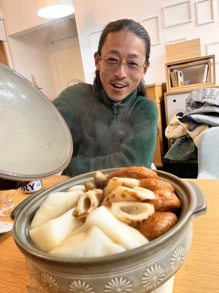 妻が用意してくれたおでんをストーブで温めながら