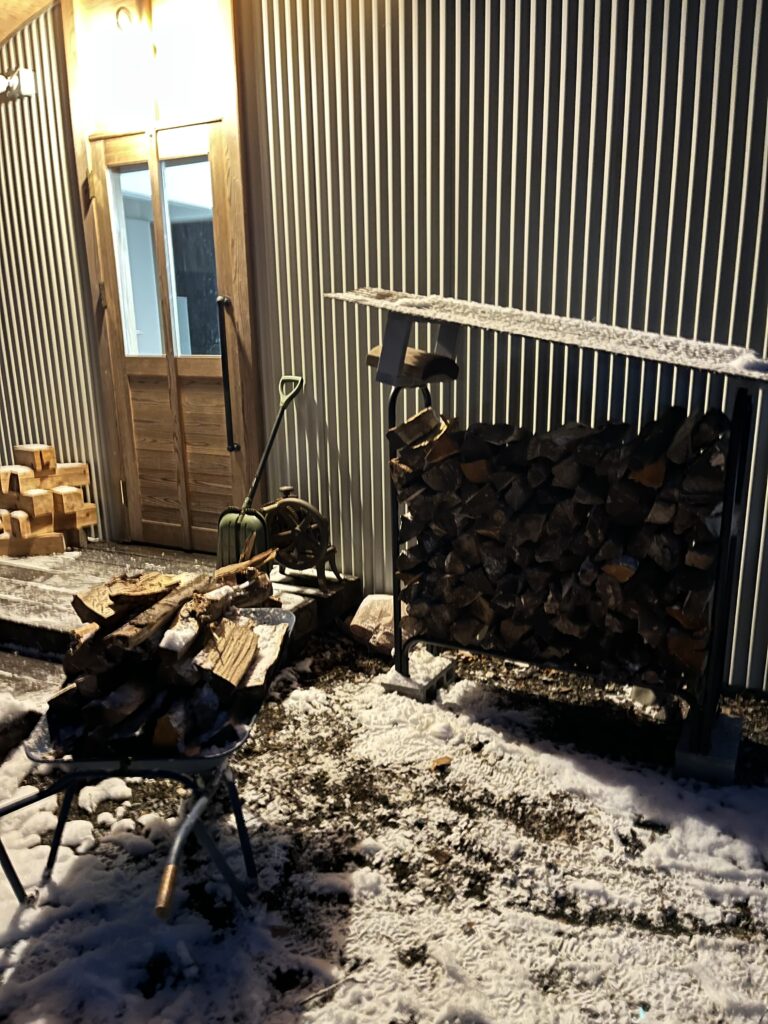 玄関のすぐそばの棚に薪を並べておきます