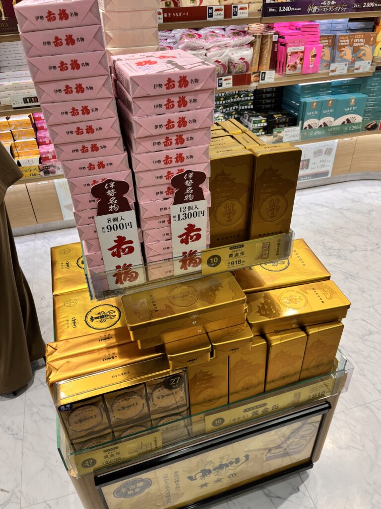 無事に名古屋に着いて、何となくお土産屋さんを覗くと赤福!いやまだ早い帰りに買いましょ。それよりもその隣の黄金の缶!!!