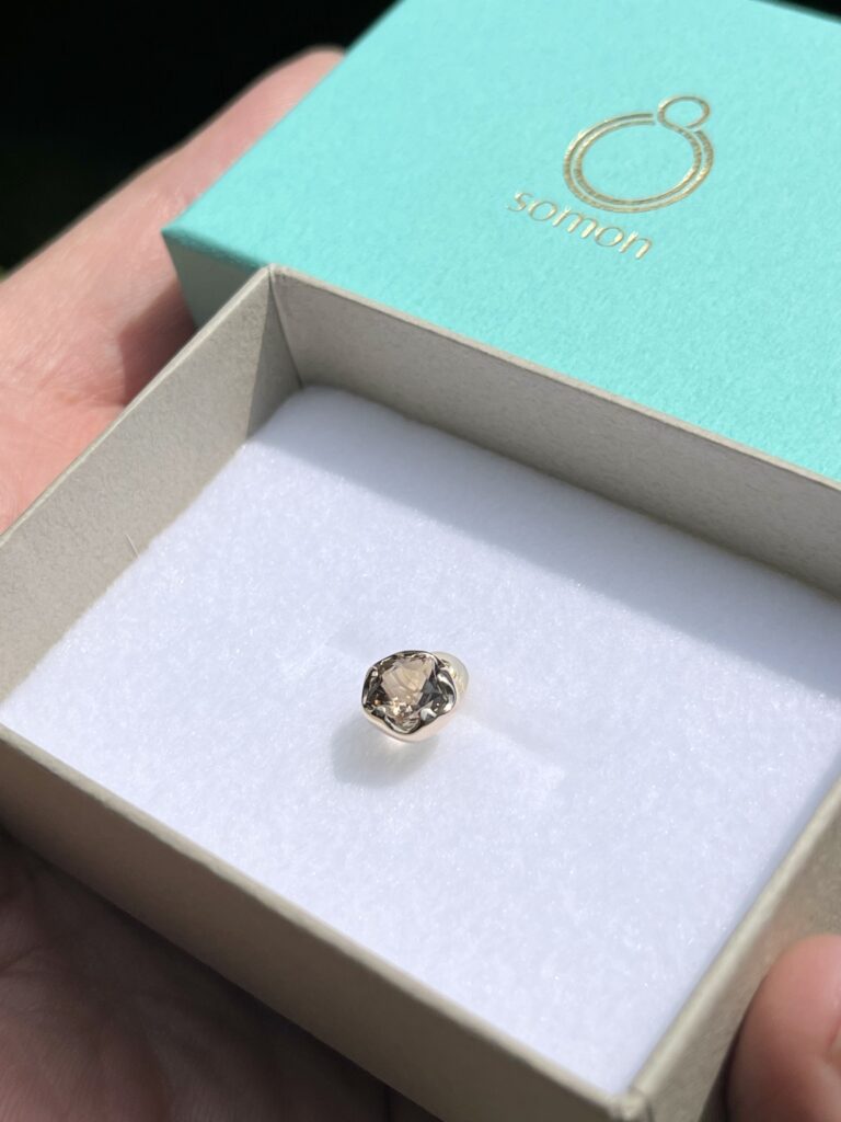5角形のスモーキークォーツを飾り覆輪で