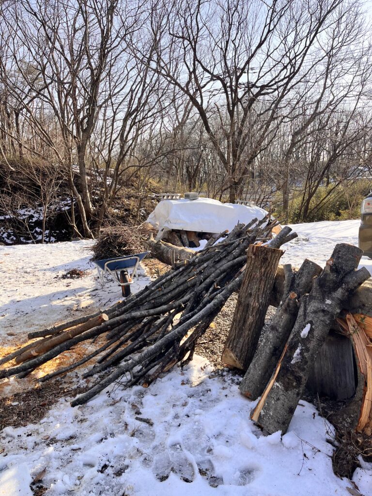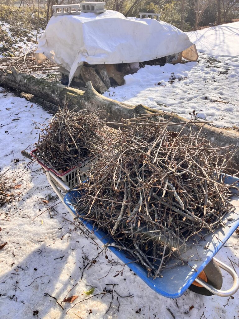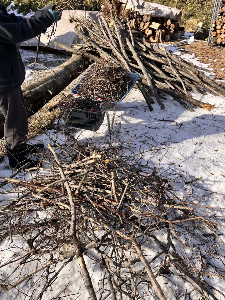 細かい枝は「焚き付け」って最初に火をつける時の着火剤みたいに使います